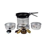 Stove with 2 ultralight aluminum 1.0 L saucepans, 1 ultralight aluminum non-stick 7" fry pan. Weight: 1.63 lbs (740 g). 16% lighter than standard Trangia 27 series stoves.