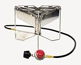 This all-stainless, collapsible, high output propane burner puts out 5,000 to 65,000 but/hr from low cooking settings all the way to a blast to quickly heat water. Unique folding legs collapse the unit to the size of a typical phone book for easy stowage. Canvas carry bag included. Assembled: 10"x12"x12". Made entirely of heavy gauge stainless steel, the Power Stove will support over 100 pounds of weight. The collapsible design makes it easy to store and it's super sturdy when assembled. The high-quality propane regulator lets you adjust the flame from a simmering 5,000 to a blazing 65,000 BTU/hour. Listed regulator comes with a 48" hose and attaches to bulk propane tanks. Entire unit weighs only 5-1/2 pounds and compactly stores in your dry box or kitchen box. The removable windscreens help shield the flame from wind effects. The unique flame spreader sits atop the burner tube to diffuse the flame for uniform heating. Comes with a set of ground stakes to firmly anchor the stove. The rugged storage case has a webbing carry handle and seals with a hook-and-loop flap. Lifetime warranty on the stainless steel parts of the stove and one-year warranty on the hose and seals with a hook-and-loop flap.